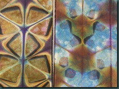 Here’s what I worked on last night. It’s three strips of a rather bland snow-dyed sateen. I braided them and put them first in a vat of hot green, then in a vat of violet. I got it rinsed, soaped and ironed. Then last night I clamped it as shown and braided it again.